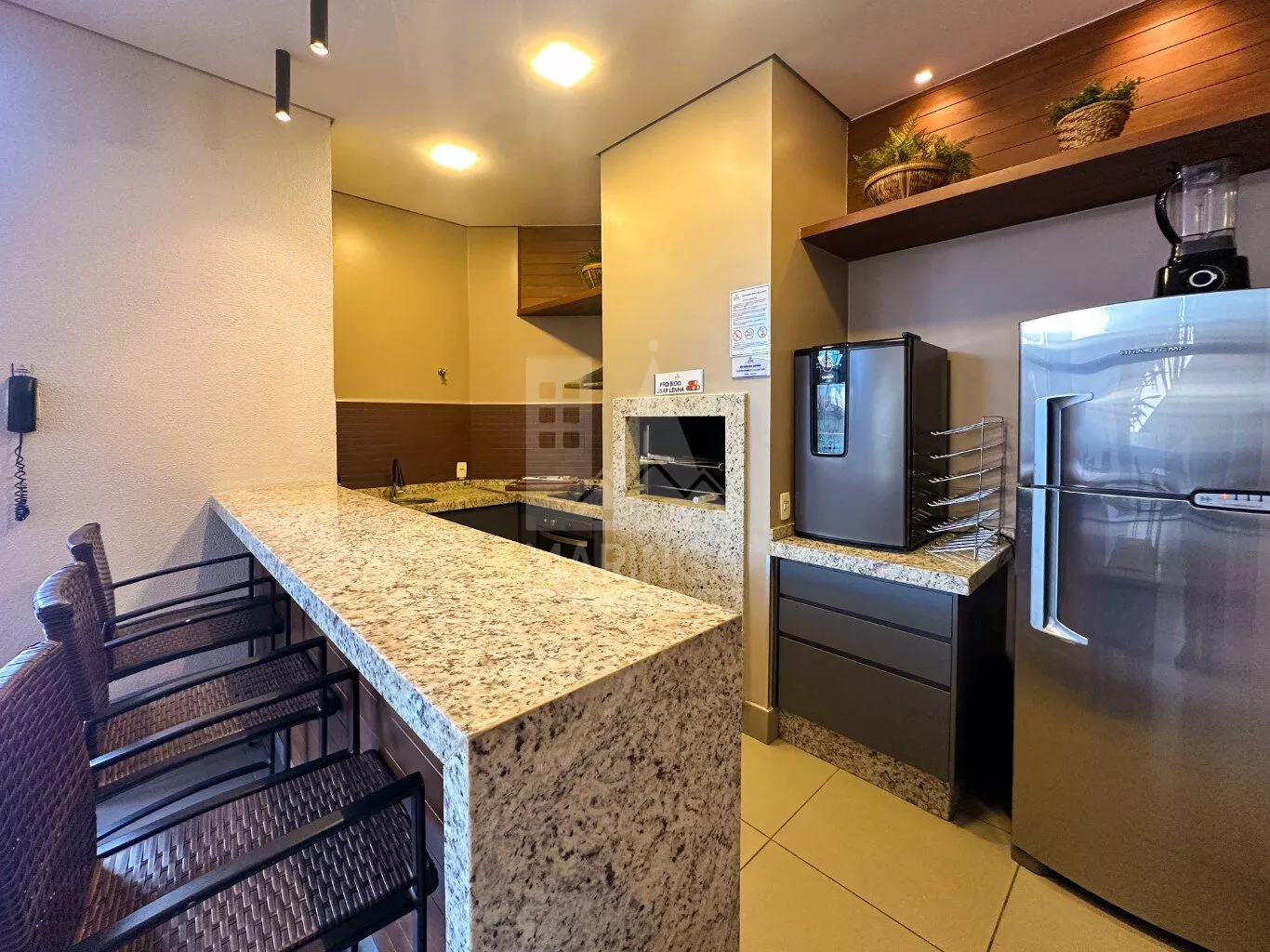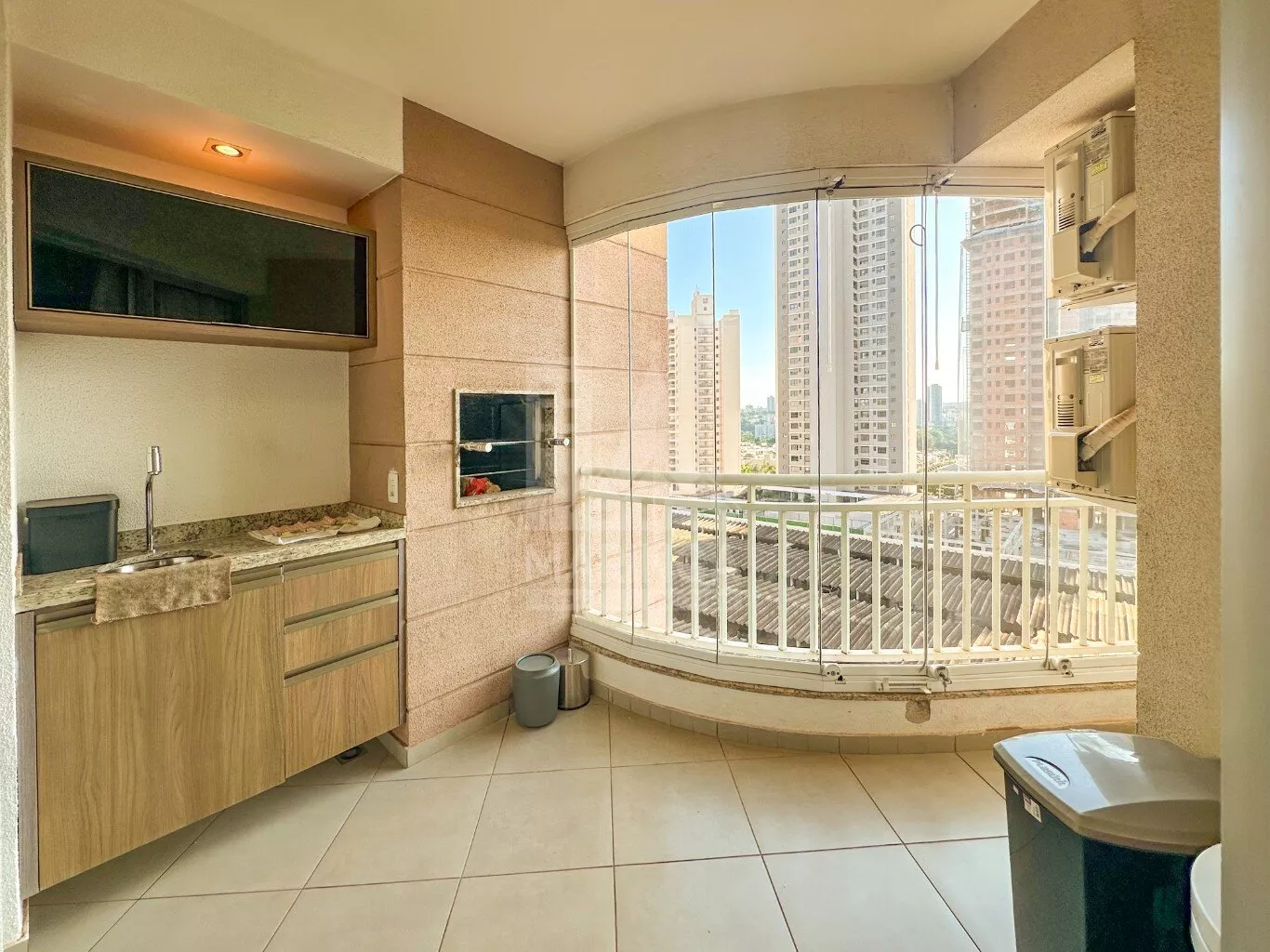 - Sacada fechada com vidro de correr, móveis planejados e churrasqueira a carvão