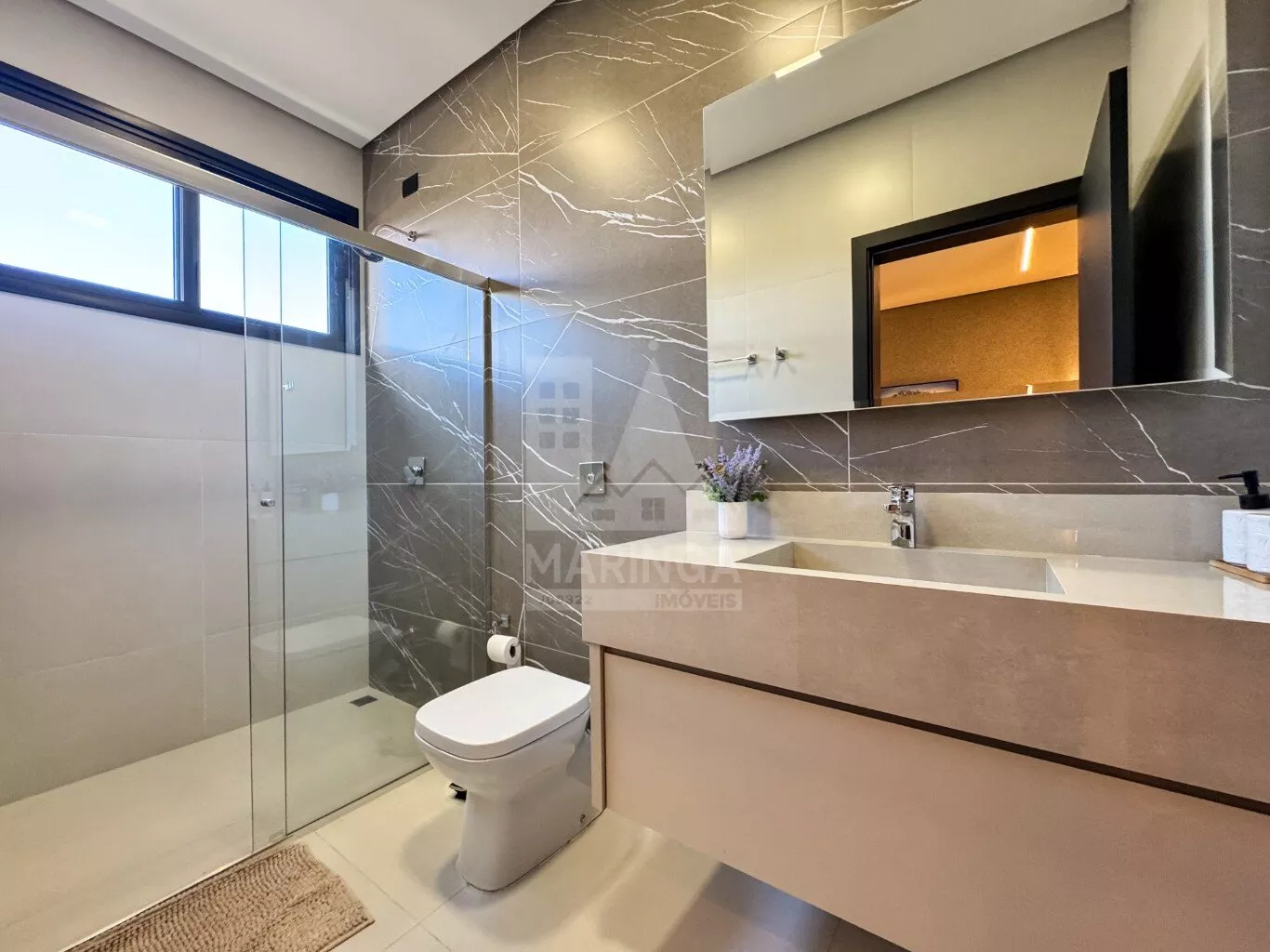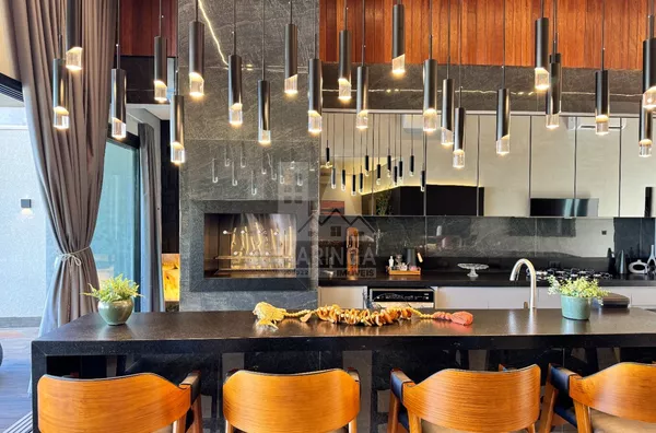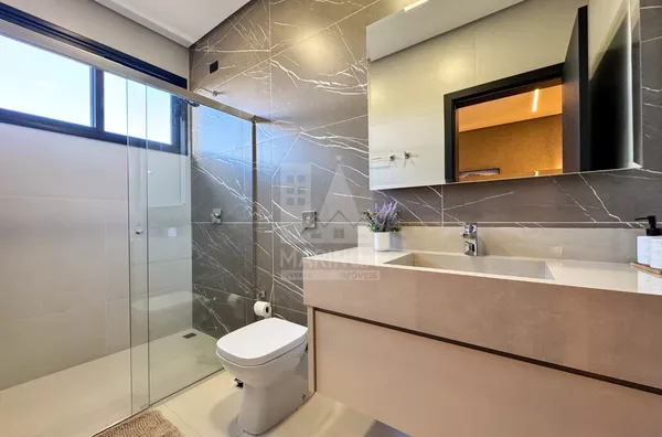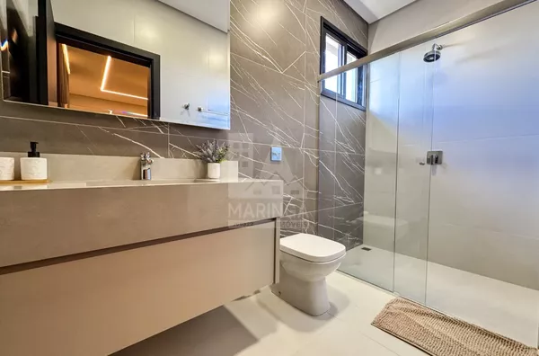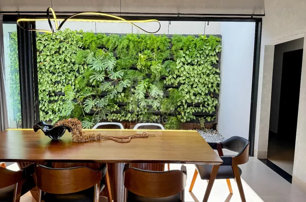 Imóvel com projeto moderno em uma área total de 328,60m², sendo 302,05m² de área construída e 25,85m² de piscina. Com aquecimento solar e redes de água fria e quente pressurizadas, a casa é um exemplo de eficiência energética.