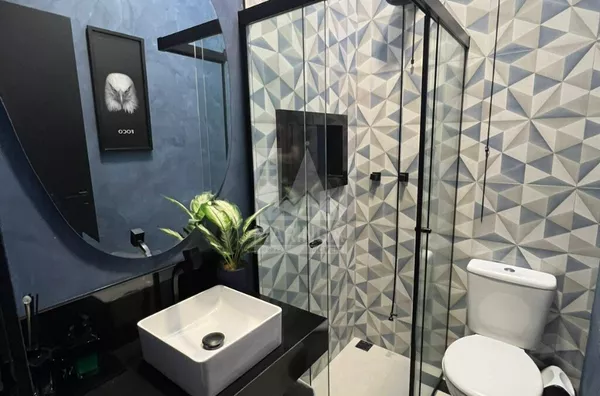 - banheiros com belo acabamento, nicho em porcelanato, box em blindex, espelho moderno com led, iluminação embutida tipo downlight