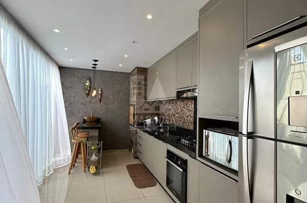 - Área gourmet integrada com a cozinha, com churrasqueira e móveis planejados, rebaixamento em gesso com iluminação moderna em pendentes, e balcão e pia em mármore, com porta em blindex.