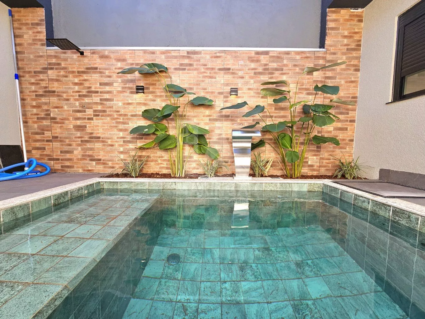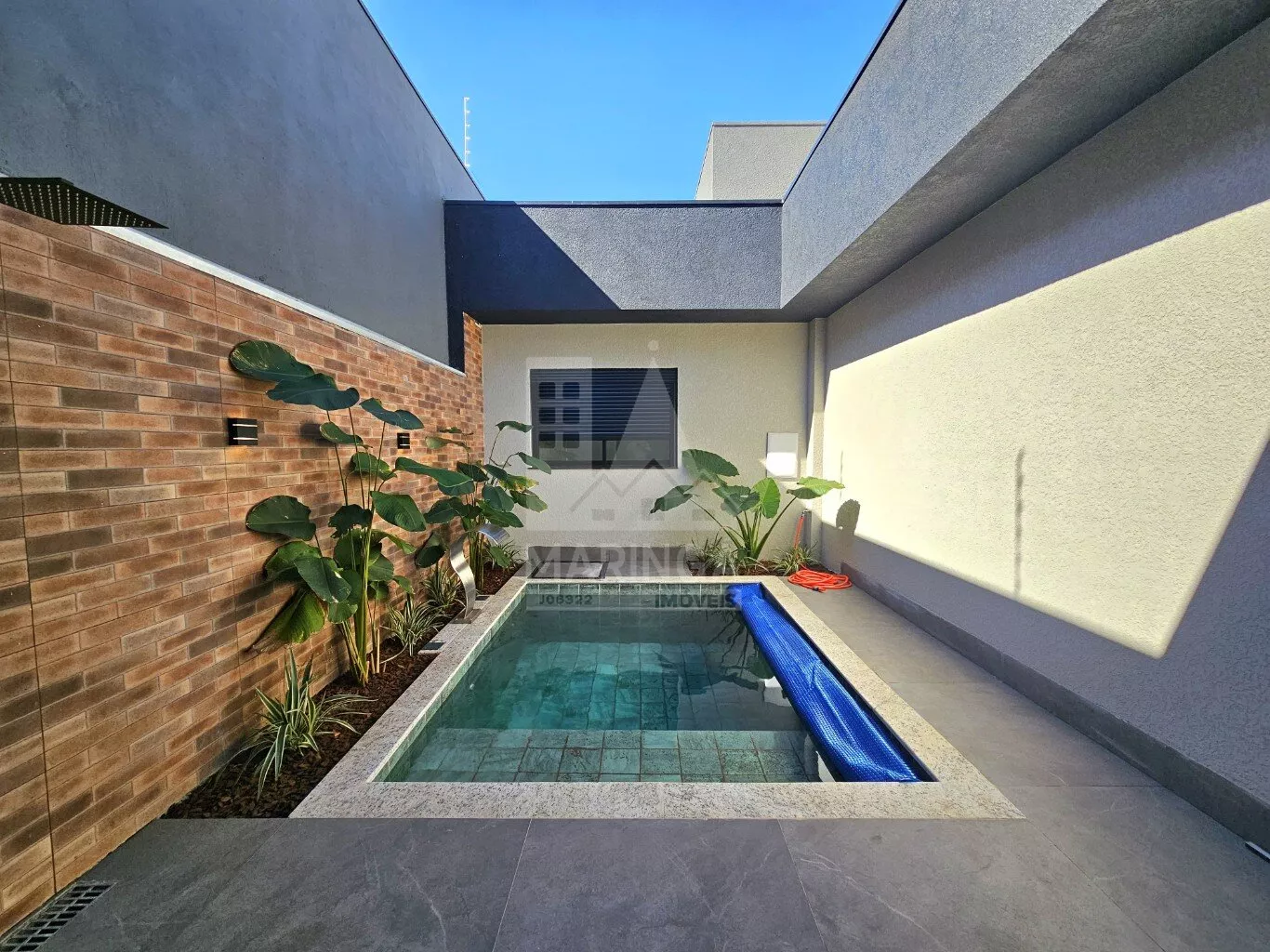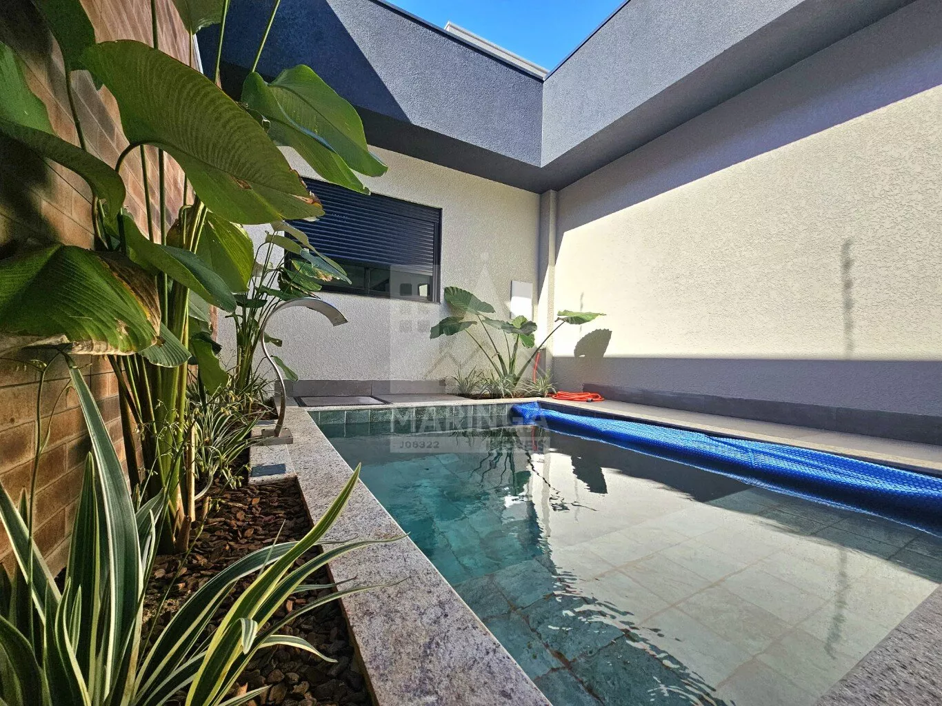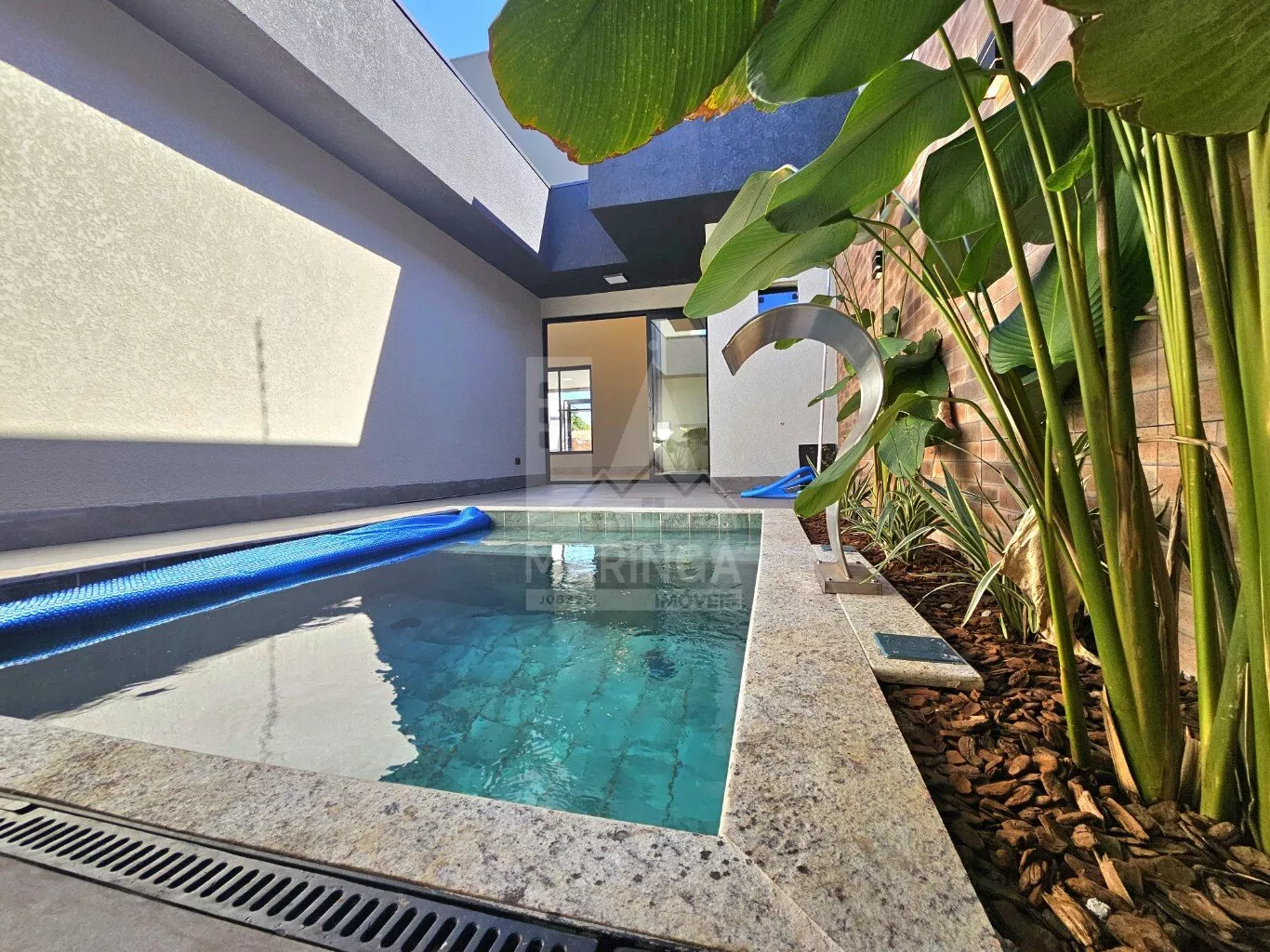 - Jardim na frente e piscina;