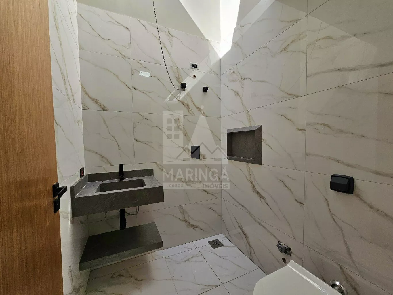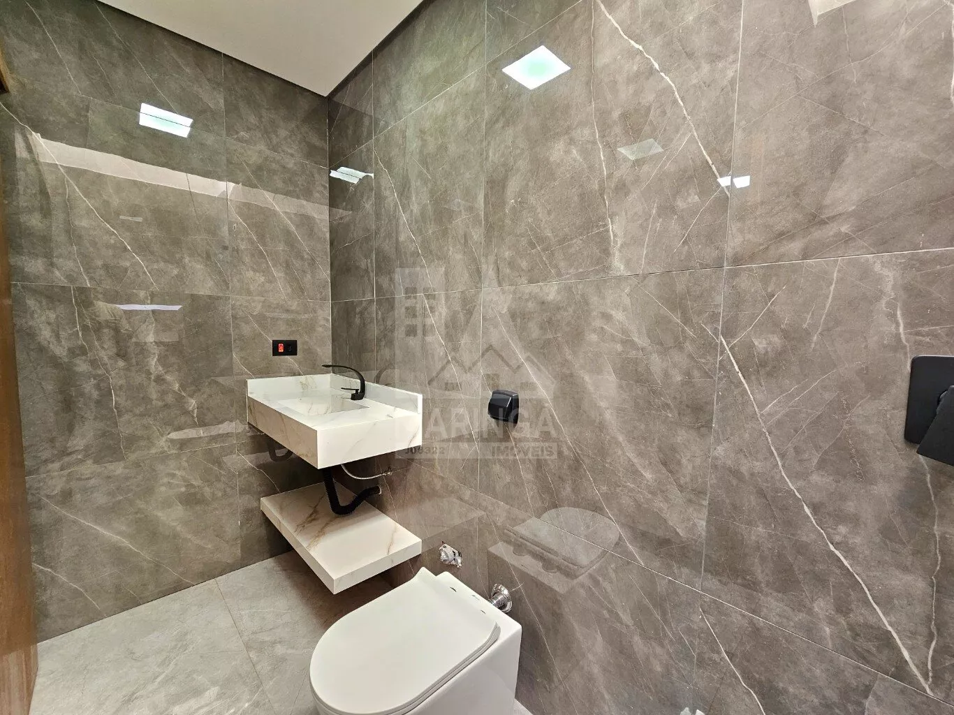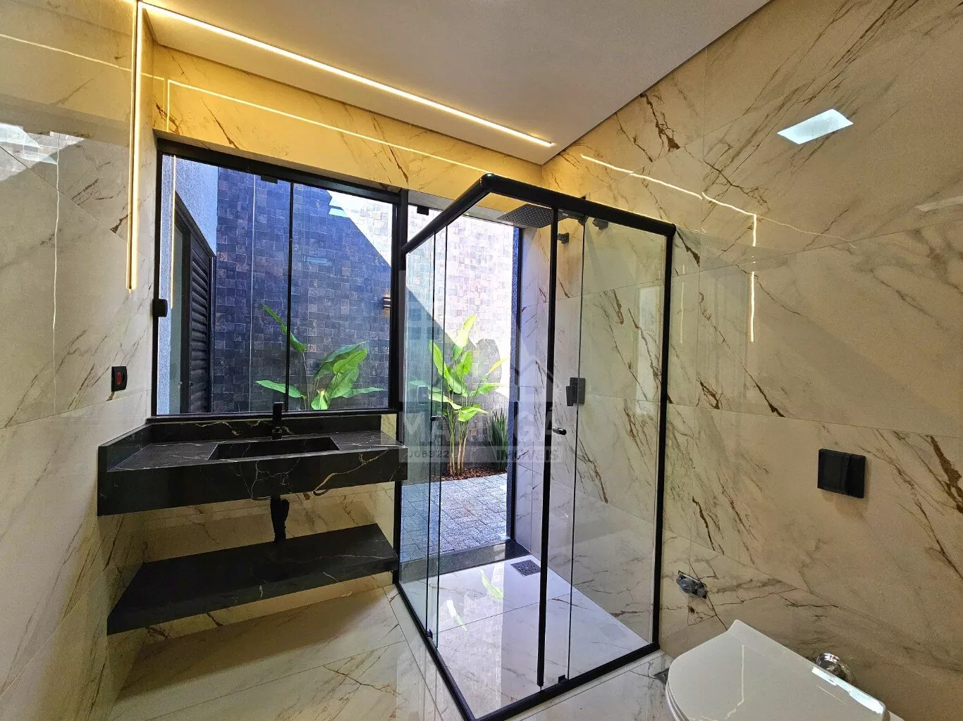 - Revestimento do chão ao teto em porcelanato;
