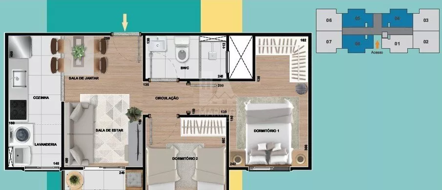 Localizado na região sul, próximo ao Unique Medical Center, Cidade Aruna e com fácil acesso ao centro de Maringá, o apartamento fica no quinto andar, face para o sol da manhã com ótima vista;