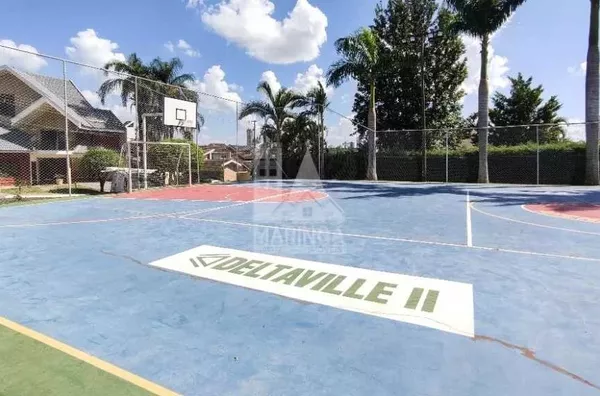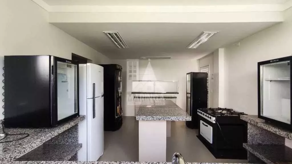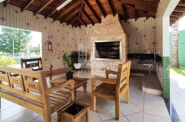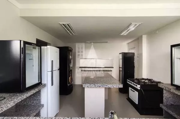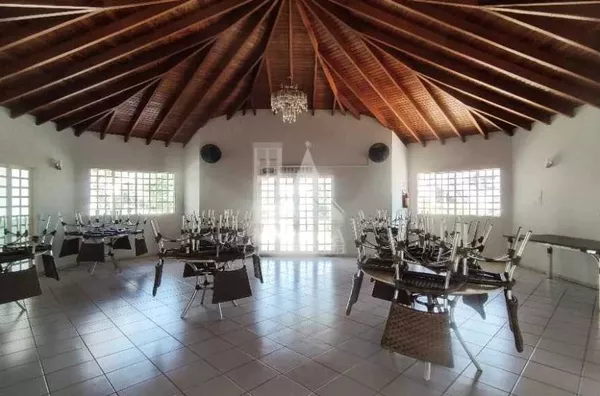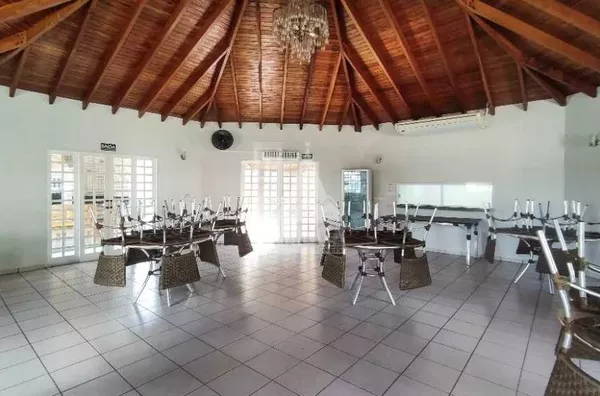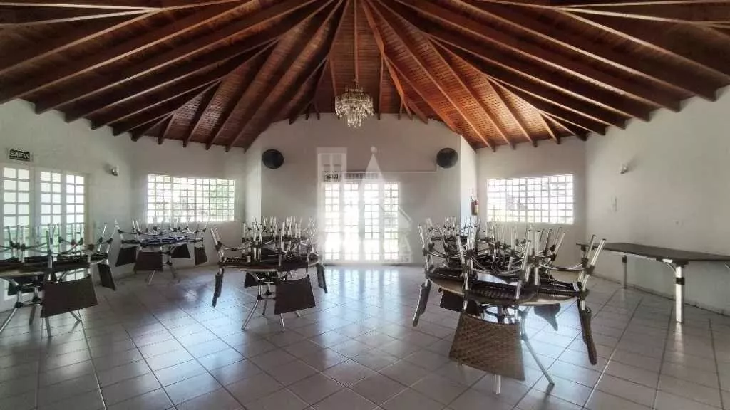 Ampla área de lazer com 1.800m² possuindo salão de festas e de jogos, cozinha, quadra poliesportiva e vestiários.