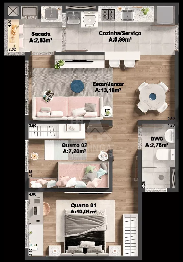 - Área útil de 52m²